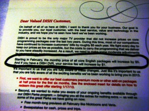 “Starting in February, the monthly price of all core English packages will increase by $5. And if you have a DISH DVR, your service fee will increase by $1.”