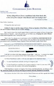 Quite how Mister Boehner & Co intend to achieve this dethronement isn’t made clear, but the letter is an obvious attempt to a) obtain money (“Enclosed is my most generous financial gift……etc.) and, b) obtain a quantity of heavily loaded data to ‘prove’ the majority of Americans are solidly behind Boehner & Co’s devious tactics.