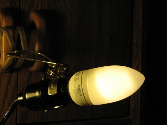 We needed new bulbs in the bathroom. The light fitting is a lovely china antique and housed three ‘candelabra-type’, energy-guzzling, bulbs. While in Lowes Hardware Store recently we saw the ‘latest’ candelabra-type low-energy bulbs. They were quite expensive, but would look good in our bathroom light fitting, so we bought three.