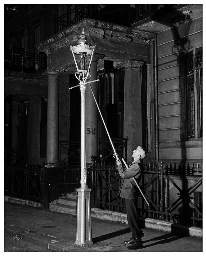 He always carried a very long pole, with a hook on the end. At each lamp he’d dismount from his bike, lean it against the lamppost, and with the long pole reach up and pull on a hook just under the lamp glass.